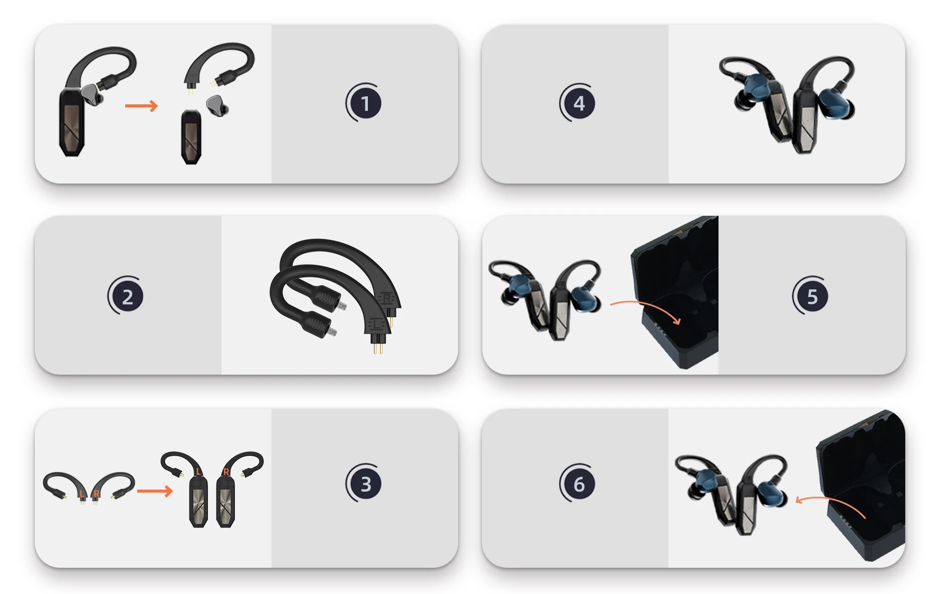 Connect the ear hooks and earplugs, making sure to distinguish the left and right, and be careful to avoid bending the pins.